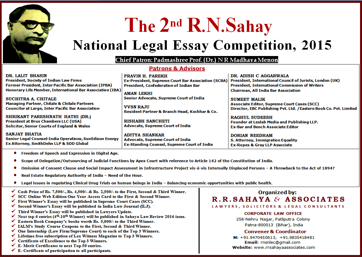 R.R. SAHAYA & ASSOCIATES (RRSA), under the patronage of Padmashree Prof. (Dr.) N.R. Madhava Menon, is pleased to announce the 2nd edition of The R.N. Sahay National Legal Essay Competition.