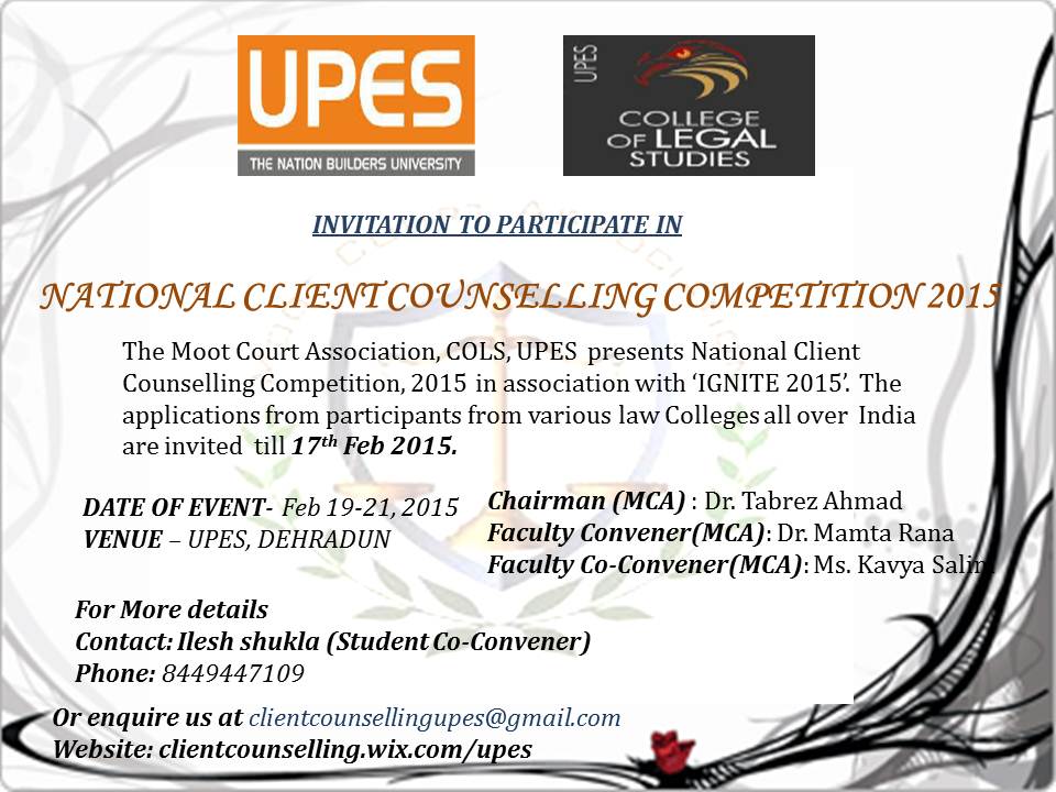 College of Legal Studies, UPES presents 3rd UPES National Client Counselling 2015 which will be held on 19th, 20th and 21st February.