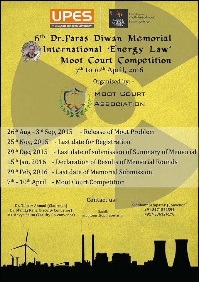 The College of Legal Studies (CoLS), University of Petroleum and Energy Studies (UPES) is exhilarated to notify the initiation of the 6th Dr. Paras Diwan Memorial International “Energy Law” Moot Court Competition, 2016.