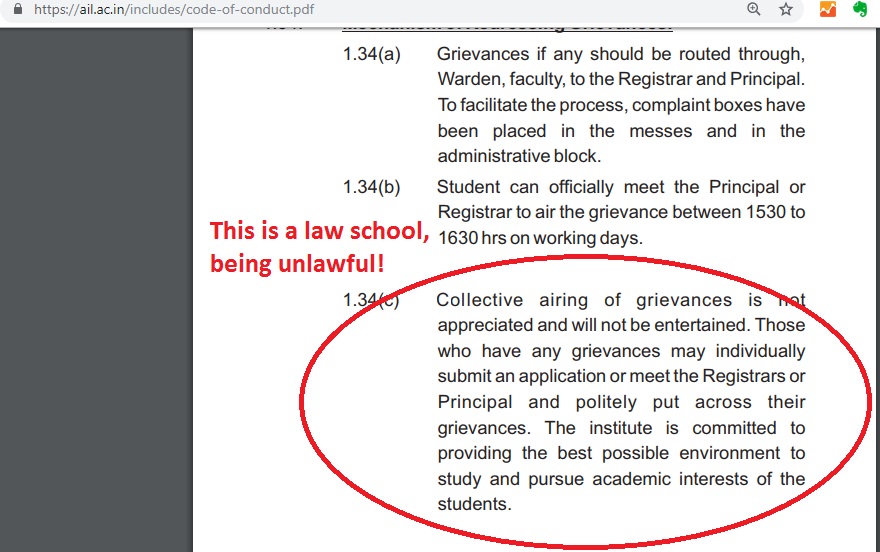 Shockingly, AIL Mohali’s ‘Code of Conduct‘ for students prevents ‘collective airing of grievances’, which violates the fundament right of speech and expression and to form associations or Unions.