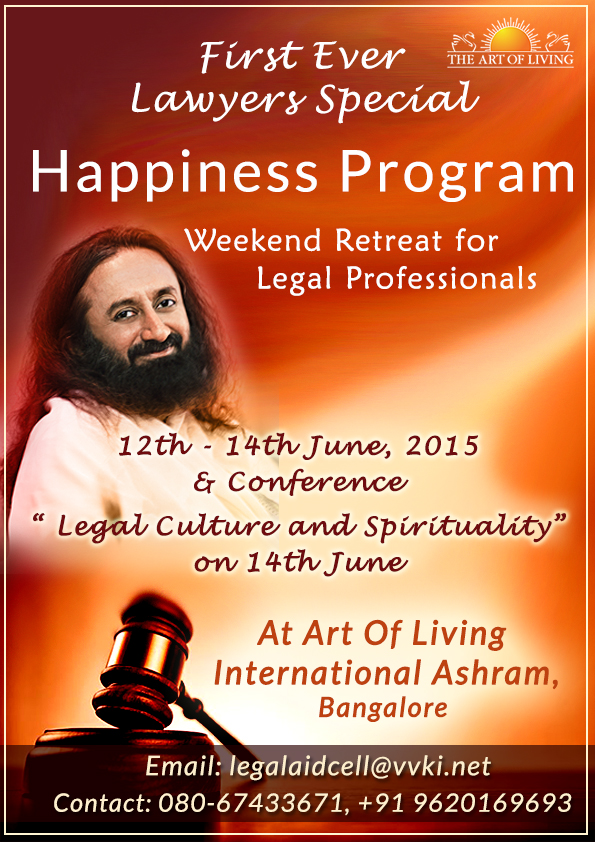 · Legal Culture and Spirituality Conference from 9 am to 2.30 pm on Sunday. Key note address by Pujya Sri Sri Ravi Shankar ji. It will also have eminent speakers from the legal field. (14 June)