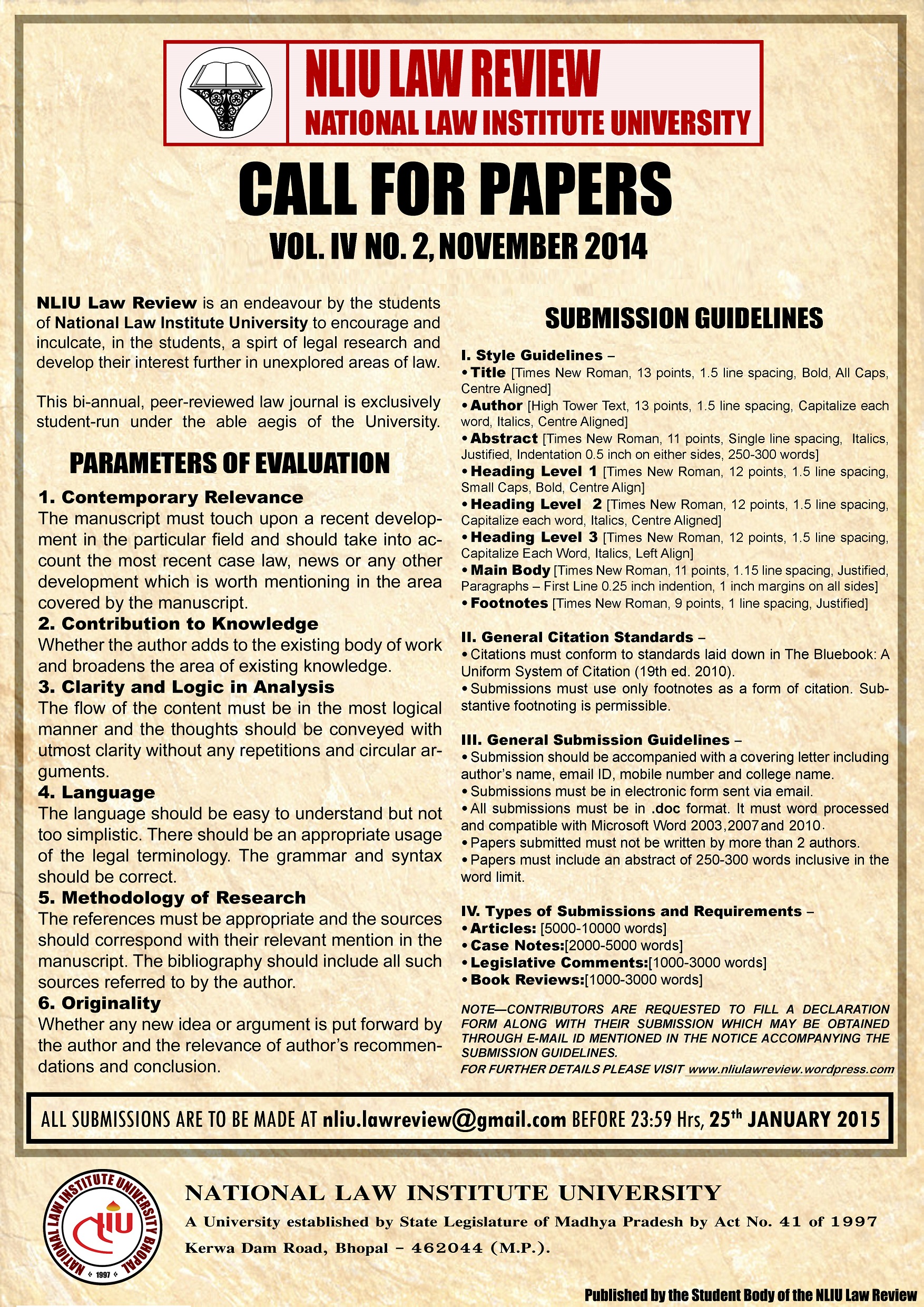 NLIU Law Review seeks to publish original and scholarly writings on any area of law. The submissions must be relevant, up to date and of interest to the academic community.