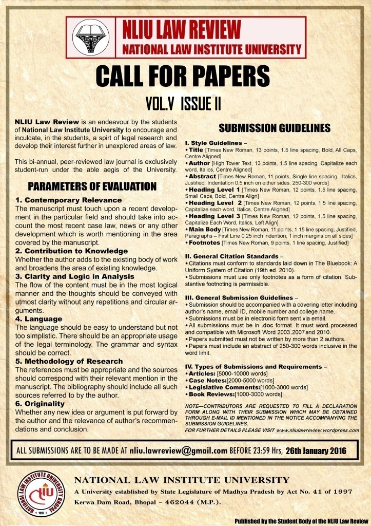 NLIU Law Review is a first of its kind endeavor on the part of the student body of the National Law Institute University, Bhopal to encourage and inculcate in the students a spirit of legal research.