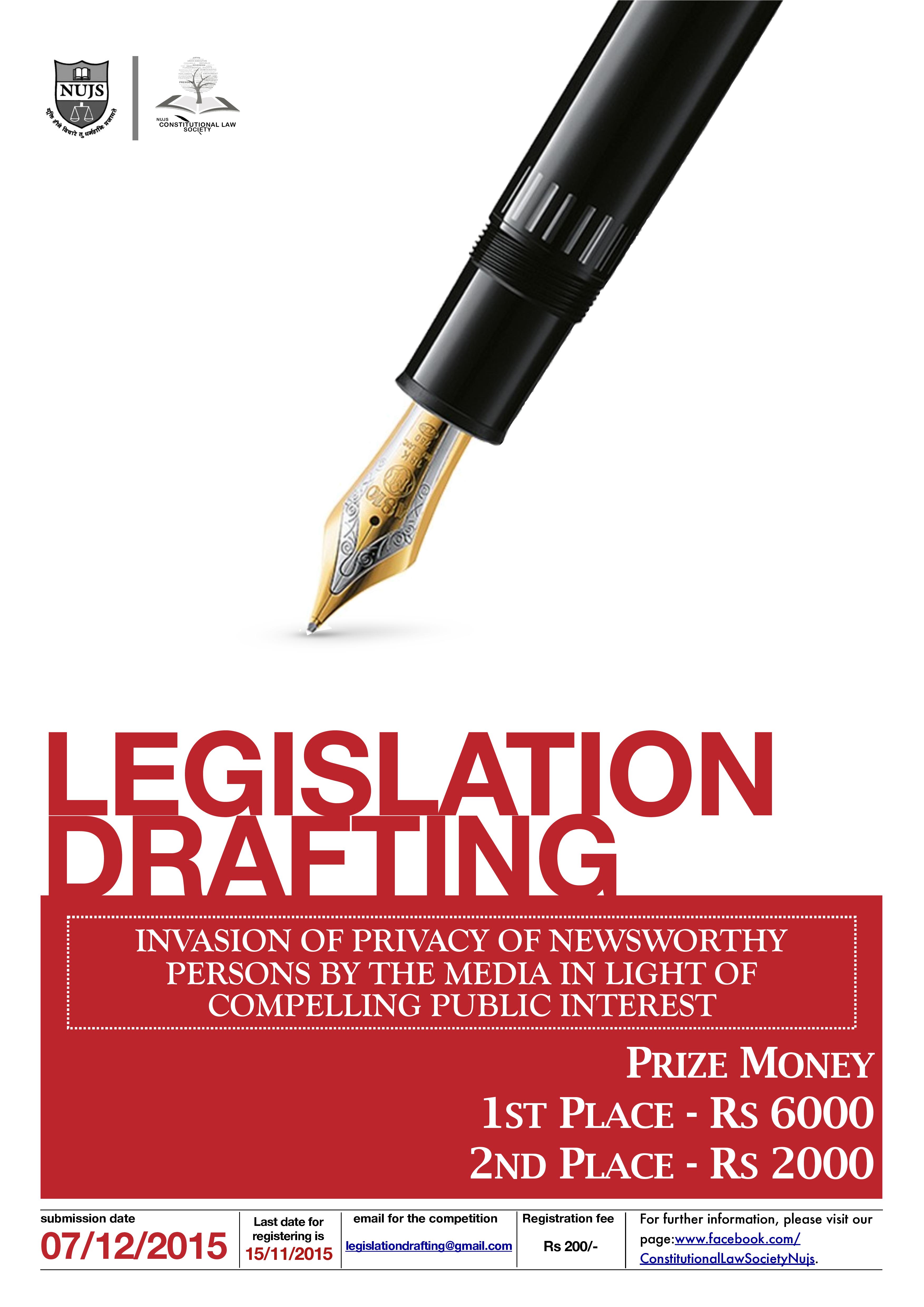 The Constitutional Law Society of the West Bengal National University of Juridical Sciences is pleased to organise the 2nd Legislation Drafting Competition on the topic “Invasion of privacy of newsworthy persons by the media in light of compelling public interest”.