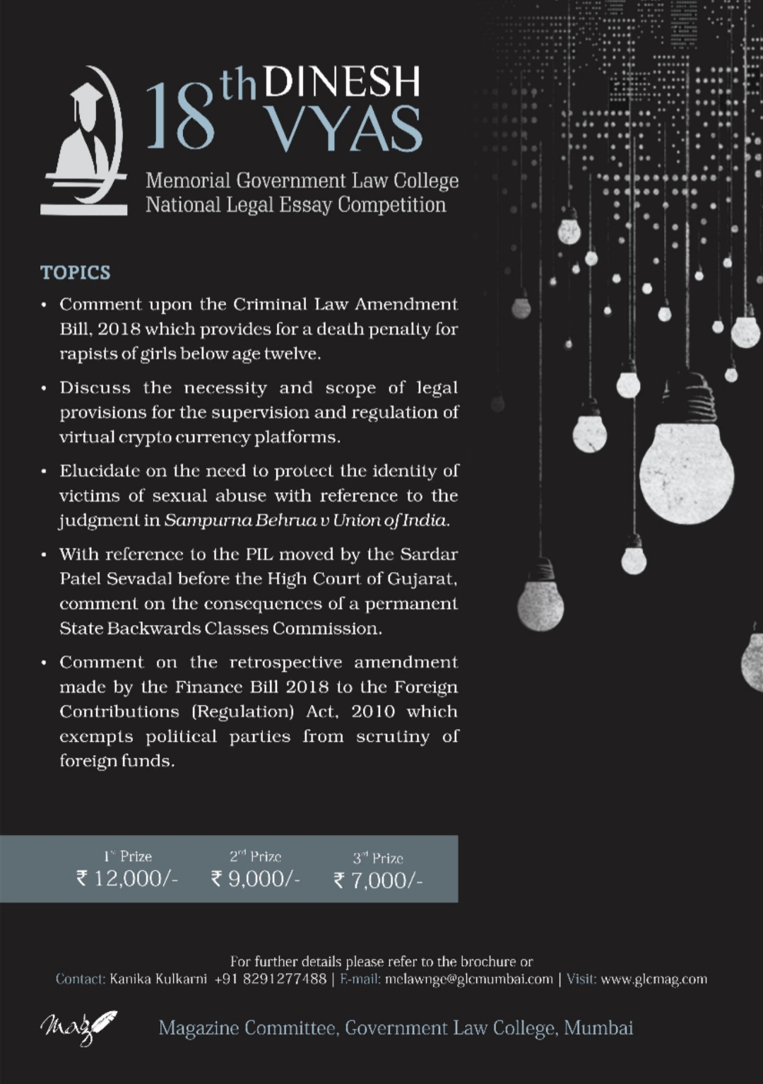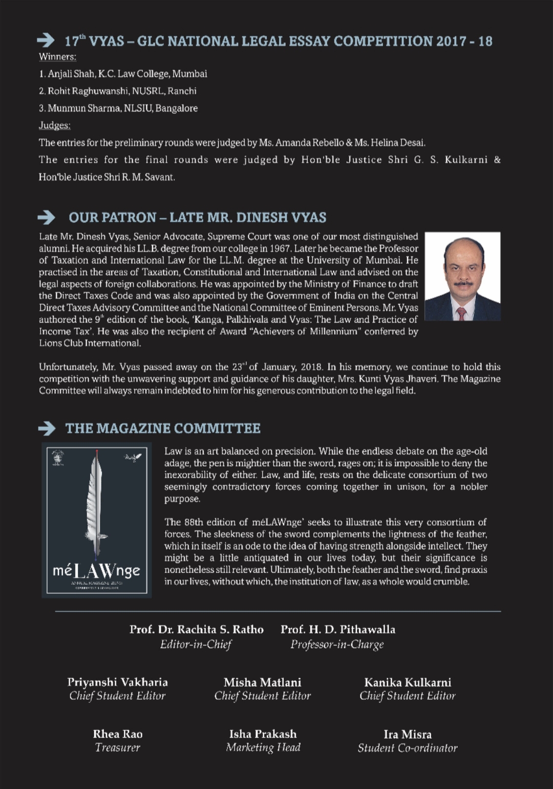 The Dinesh Vyas Memorial Government Law College National Legal Essay Competition is sponsored in the memory of Late Mr Dinesh Vyas, one of GLC’s most distinguished alumni, who obtained his LLB degree from Government Law College in 1967.