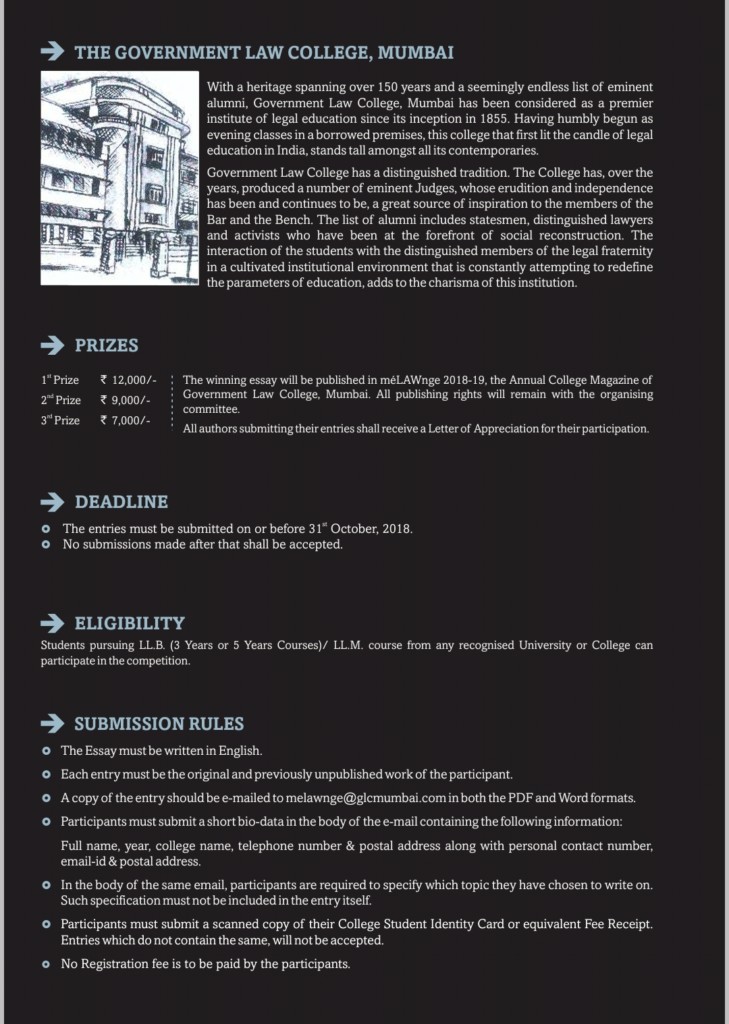 Writing is a proclivity that a lawyer must never detach from himself, and thus, each year, the Magazine Committee of Government Law College, Mumbai, organises a national level legal essay writing competition, The Dinesh Vyas Memorial Government Law College National Legal Essay Competition.