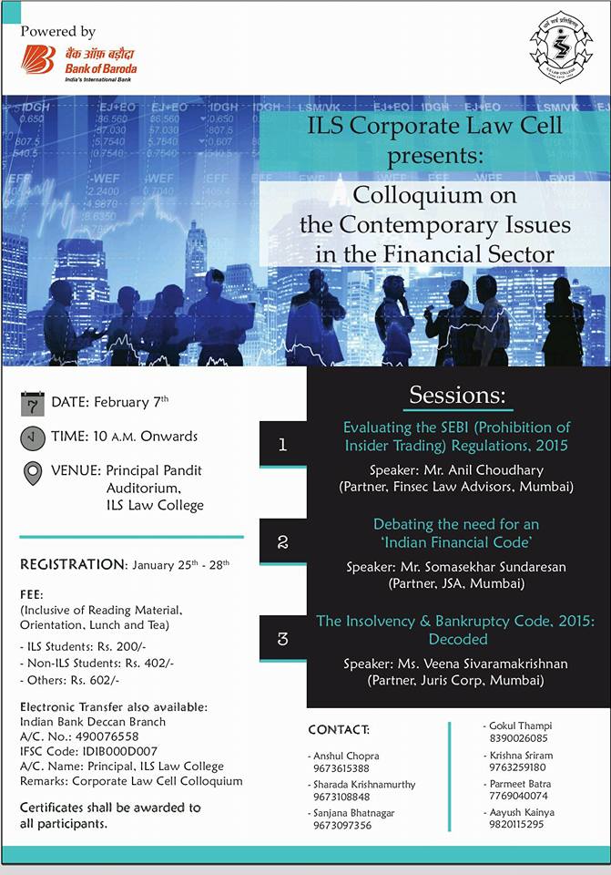 Account name: Principal, ILS Law College. (Kindly mention in the remarks that this money is for participation in the Corporate Law Cell Colloquium)