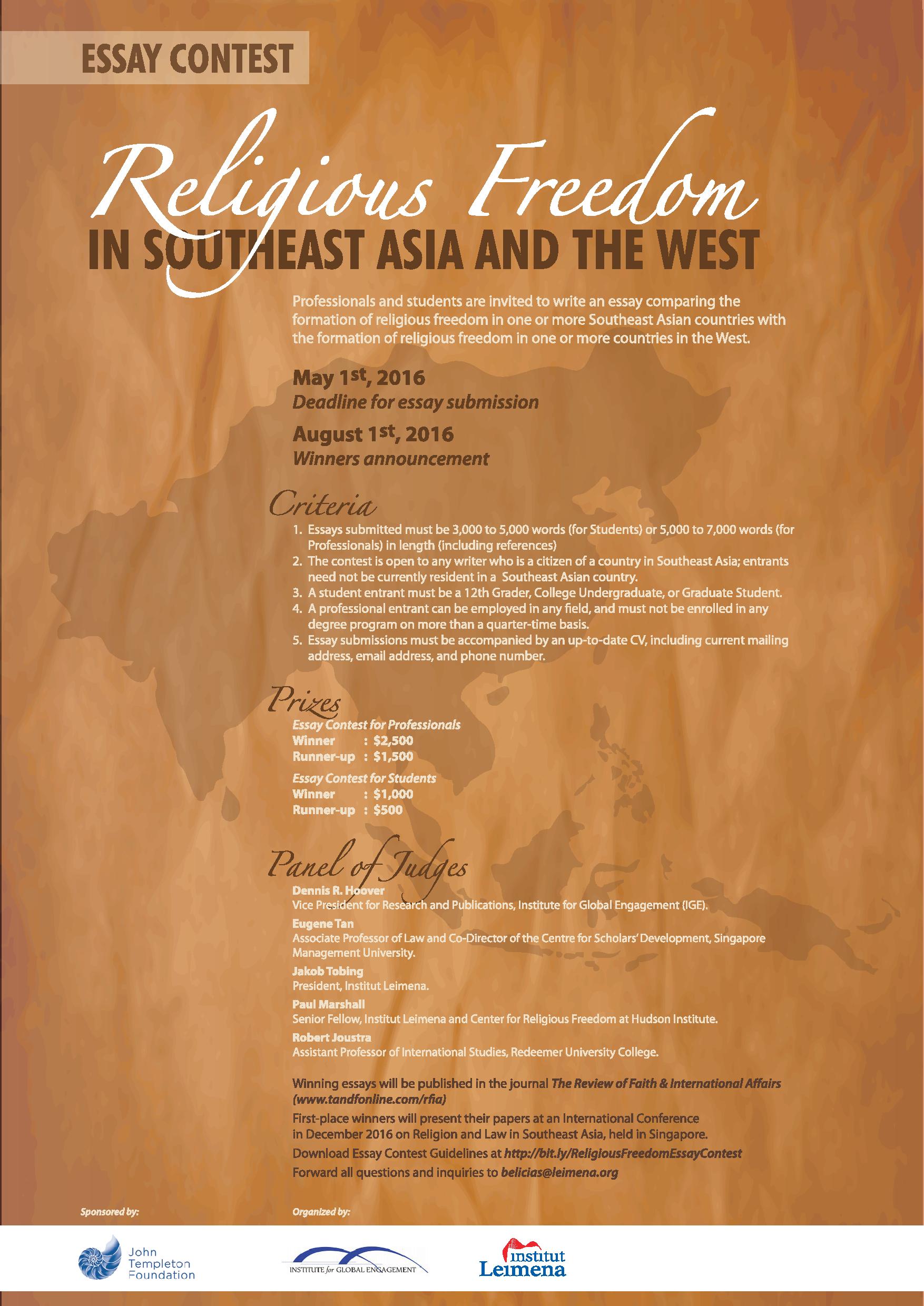 Institute for Global Engagement’s Essay Contest on Religious Freedom in Southeast Asia and the West [US]: Submit by May 1