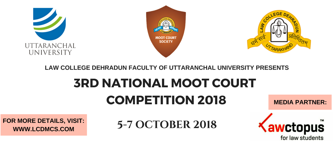 Law College Dehradun, faculty of Uttaranchal University delightedly announces the 3rd edition of its National Moot Court Competition on Constitutional Law and solicits the participation of LLB (3/5 years course) and LLM students from Law Universities/Colleges in India to this thought-provoking and intellectually-satisfying voyage scheduled for 5-7 October 2018 at Dehradun in the lap of Devboomi Uttarakhand.