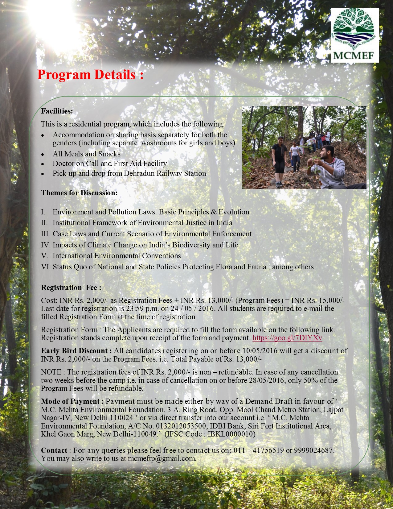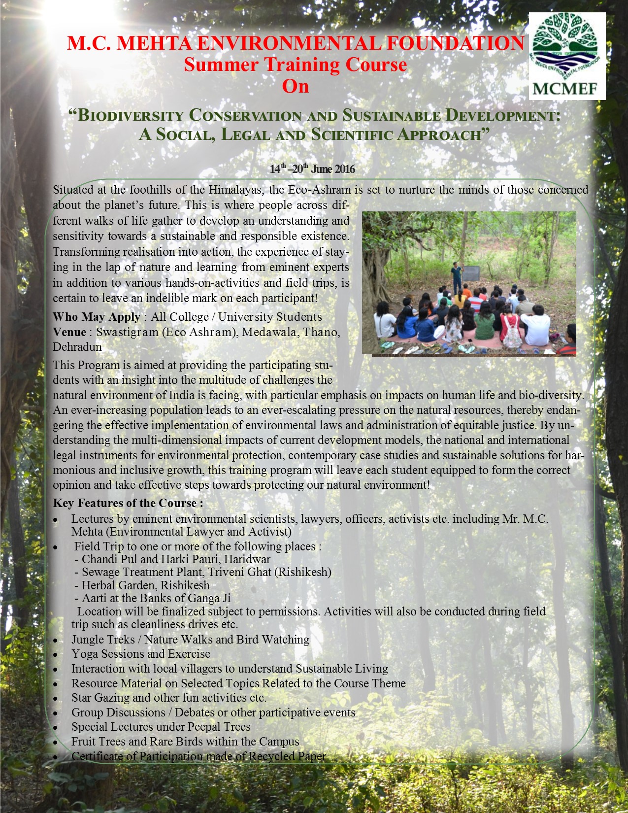M.C. Mehta Environmental Foundation invites students to participate in a Summer Training Course (Residential).