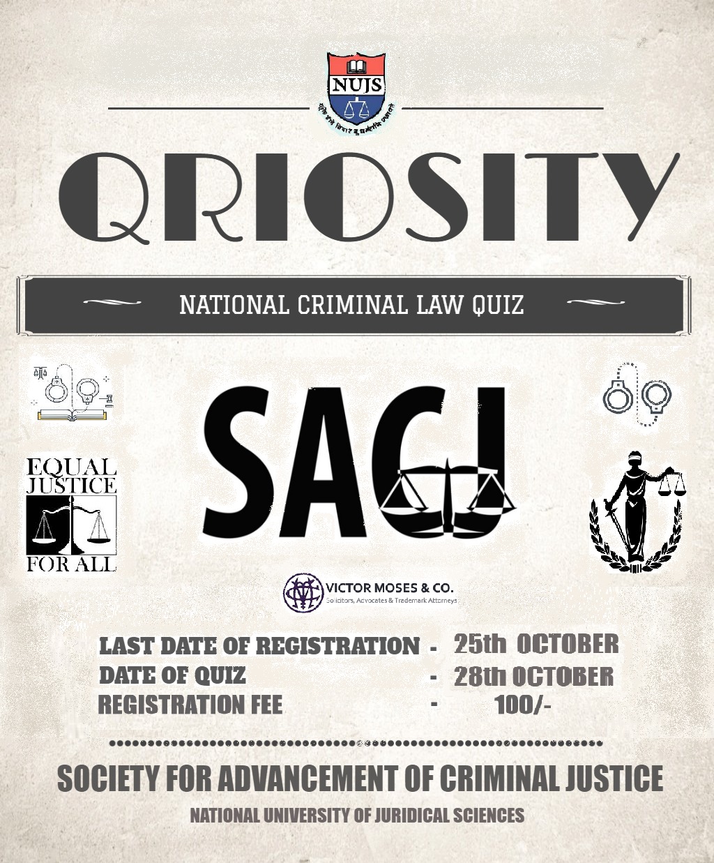 The Society for Advancement of Criminal Justice (SACJ) at West Bengal National University of Juridical Sciences (WBNUJS), Kolkata, is proud in announcing the commencement of its annual flagship event, the 3rd QRIOSITY Online Quiz Competition 2018.