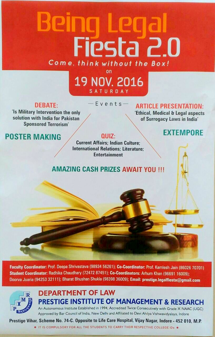 The Department of Law, Prestige Institute of Management & Research, Indore is organizing a National Literary Festival on the 19th of November, 2016 (Saturday).