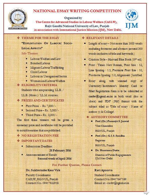 Home Opportunities Essay Competitions RGNUL’s Essay Writing Competition on Exploitation of Labour: OpportunitiesEssay Competitions RGNUL’s Essay Writing Competition on Exploitation of Labour: [UPDATED RESULTS] By Lawships - June 5, 2016 209 FacebookTwitterPinterestWhatsApp First published on 29th January, 2016. Results are HERE. For further details, click HERE. RELATED ARTICLESMORE FROM AUTHOR Nirma Internațional Conference on Law by Nirma University, Ahmedabad: Submit Extended Abstract / Full Research Paper by Jan 02, 2026! Internship Opportunity at Cashfree, Bangalore: Applications Open Call for Papers: Comparative Constitutional Law and Administrative Law Journal [Vol 5, Issue 1]: Submit by July 15 Call for Blogs: All India Legal Forum: No Fees, Rolling Submissions Webinar Session on Academic and Article Writing by NALSAR Alumni Cell [June 14, 5 PM]: Register Now! LEAVE A REPLY Cancel reply Please enter your comment! Please enter your name here You have entered an incorrect email address! Please enter your email address here Save my name, email, and website in this browser for the next time I comment.