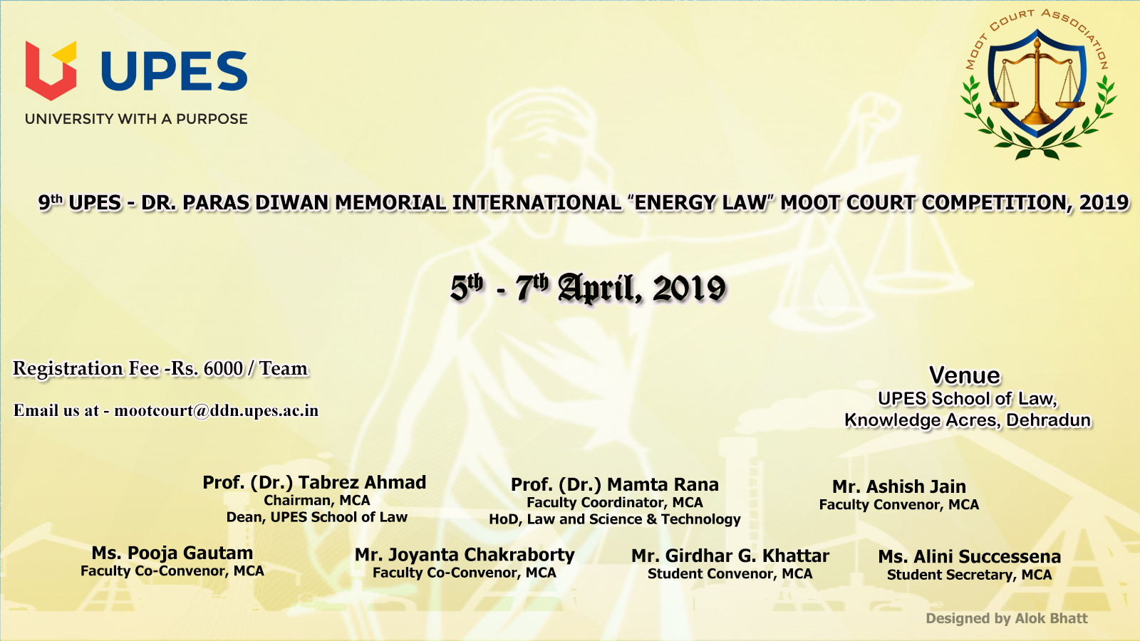 UPES School of Law proudly announces its 9th edition of “UPES – DR. PARAS DIWAN MEMORIAL INTERNATIONAL ‘ENERGY LAW’ MOOT COURT COMPETITION, 2019’. The competition is scheduled from April 5, 2019 to April 7, 2019.