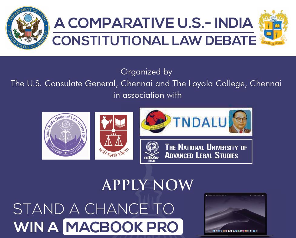 The U.S. Consulate General Chennai in collaboration with Loyola College, Chennai is conducting “A U.S. – India Comparative Constitutional Law Debate” scheduled to culminate with a final debate competition in Chennai on September 14, 2019.