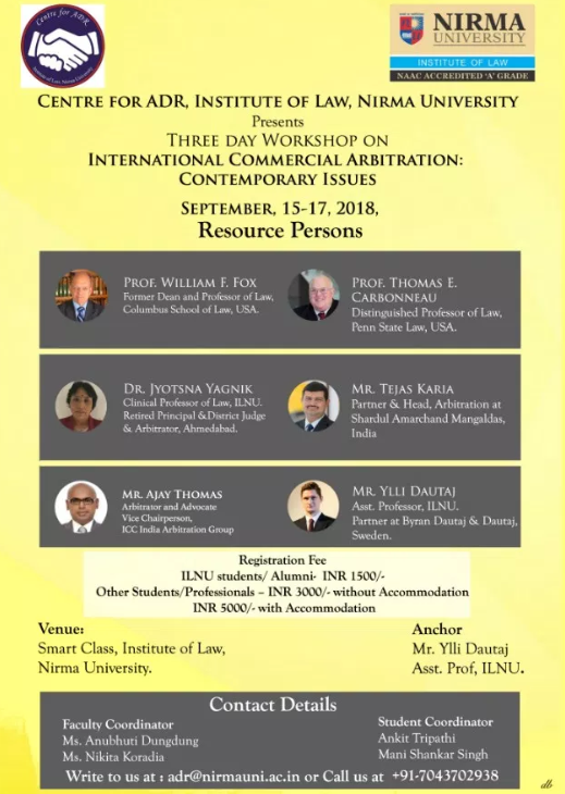 In the backdrop, Centre for ADR, ILNU is organizing an ADR workshop on “International Arbitration (Commercial and Investment) and Contemporary Issues.” The program will provide an understanding of the general principles of domestic as well as International Arbitration and its relationship to other dispute resolution processes.